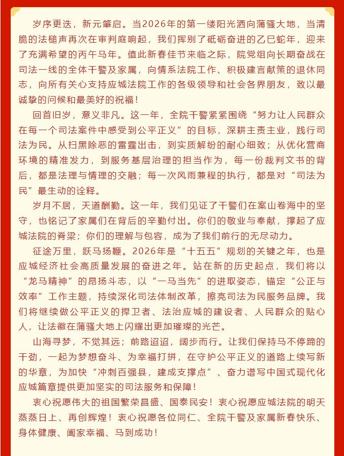 策马扬鞭启新程 法耀蒲骚向未来|应城法院2026年新春贺词