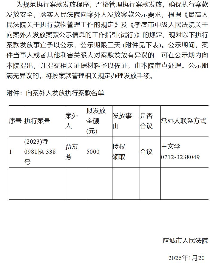 应城市人民法院关于向案外人发放执行案款的公示